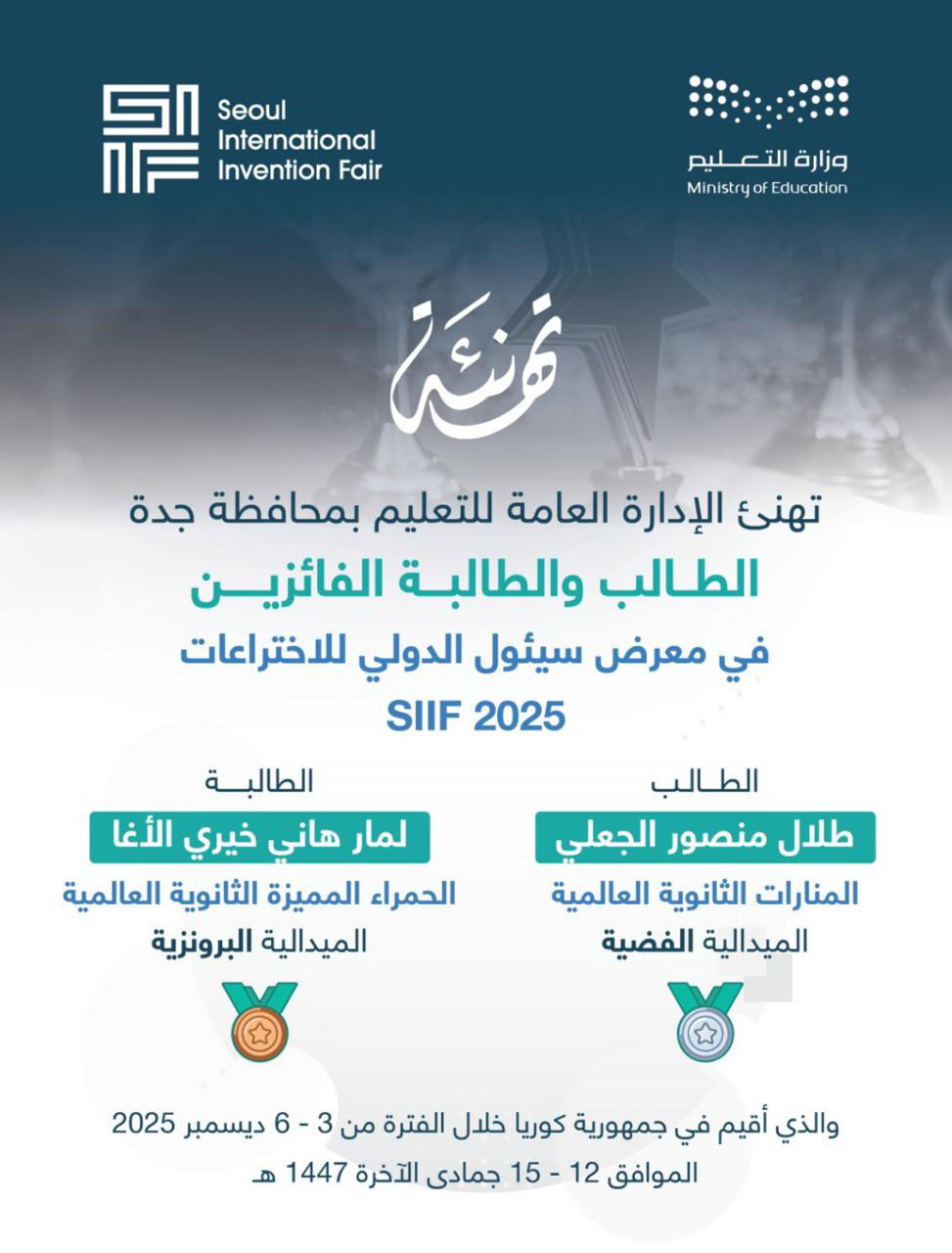 يسعد مدارس الحمراء المميزة العالمية أن تعلن عن فوز طالبتها لمار هاني الأغا بالميدالية البرونزية في معرض سيؤول الدولي للاختراعات SIIF 2025، وذلك بفضل توفيق الله ثم بجهودها وإبداعها المتميز.